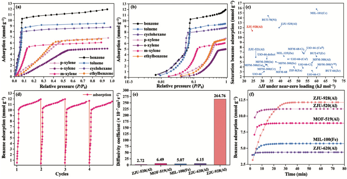 图3. ZJU-928(Al)的蒸汽吸附曲线,包括苯、甲苯、乙苯、邻二甲苯、间二甲苯、对二甲苯和环己烷(a,b),及其在低浓度时的吸附热(c),苯循环吸附性能(d),扩散系数(e)及苯吸附动力学曲线(f)