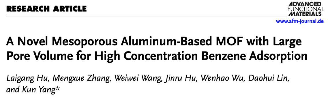 近年来,随着环境与健康问题日益受到关注,苯等有害气体的高效捕获成为研究的重点。苯是一种广泛存在的工业污染物,特别是在突发性环境事故中,对人体健康及环境造成重大影响。尽管传统的微孔MOFs在低浓度苯的吸附中表现优秀,但在高浓度吸附过程中往往受到其孔容有限的限制。相比之下,介孔MOFs因其较大的孔径和孔容,在吸附高浓度苯分子方面具有更高的潜力。然而,目前报道的高性能介孔MOFs大多含有一些毒性较大的金属元素(如铬、锌等)这限制其实际应用。开发一种无毒、稳定且具有大孔容的介孔MOFs以用于高浓度苯吸附,已成为当前研究的一个关键方向。铝基MOFs由于其原料丰富、低毒性和良好的稳定性,受到了广泛关注。铝是地壳中含量丰富的元素之一,并且与羧酸类配体的配位键具有较高的稳定性。铝基MOFs在吸附有毒气体时通常具有较低的吸附热,这意味着它们在再生过程中能够显著降低能耗。因此,设计和合成具有大孔容的铝基介孔MOFs,不仅能够满足高浓度苯的吸附需求,同时在实际应用中有助于降低能源消耗和操作成本。