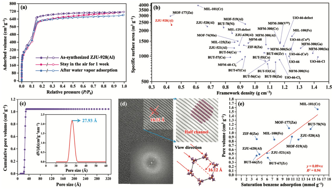 图2. ZJU-928(Al)在77 K下的N2吸附脱附等温线(a),框架密度(b),累积孔容和孔径分布(c),HRTEM图(d),以及MOFs的饱和苯吸附量与孔容的关系