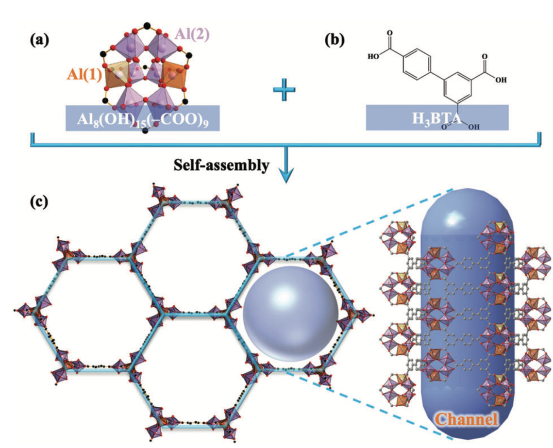 图1. ZJU-928(Al)的框架结构由Al8(OH)15(−COO)9铝簇(a)和H3BTA配体(b)所组成,其具有正六边形的孔道(c)
