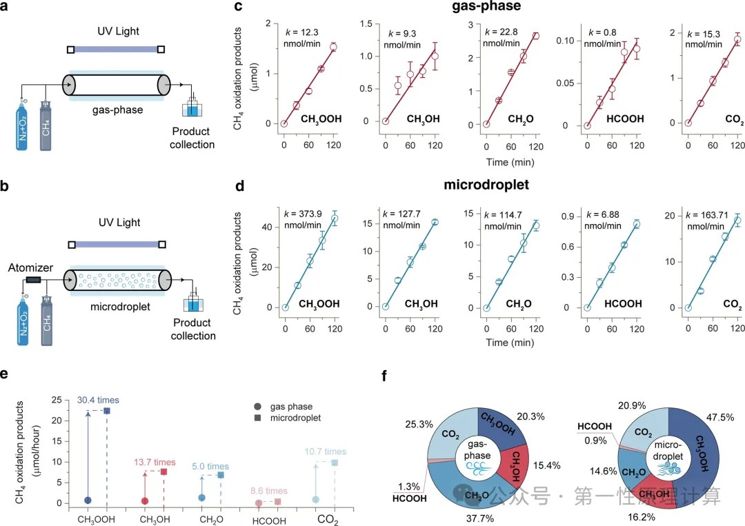 图1. 水微滴界面增强的CH₄光氧化作用。(a,b)气相系统(a)和微滴系统(b)中CH₄光氧化的示意图。(c,d)气相(c)和微滴系统(d)中CH₄氧化产物摩尔量随时间的变化。实验在控制条件下进行:恒定气流(100 sccm CH₄ + 3000 sccm N₂:O₂ [79:21 v/v])、UV辐射(λ=254 nm, 14 mW/cm²)和恒温(298 K, 25°C)。(e)气相和微滴条件下CH₄光氧化产物生成速率的比较。(f)气相和微滴系统中CH₄光氧化产物的分布特征。