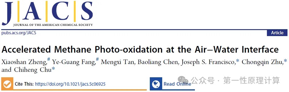 2025年7月9日,土壤污染防治与安全全国重点实验室褚驰恒、北京师范大学朱重钦团队合作在Journal of the American Chemical Society期刊发表题为“Accelerated Methane Photo-oxidation at the Air–Water Interface”的研究论文,浙江大学郑小汕、北京师范大学方业广为论文共同第一作者,美国宾夕法尼亚大学Joseph S. Francisco院士、朱重钦、褚驰恒为论文共同通讯作者。