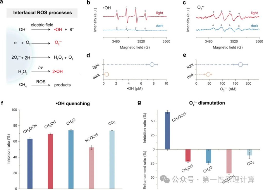 图2. 水微滴中光诱导ROS及其对CH₄氧化的影响。(a)界面ROS生成及后续CH₄氧化的示意图。(b,c)以5,5-二甲基吡咯啉-N-氧化物(DMPO)为捕获剂,通过电子顺磁共振(EPR)光谱确认UV辐射微滴中•OH和O₂•⁻的产生。(d,e)光照与黑暗条件下界面•OH和O₂•⁻产率的比较。(f)使用叔丁醇作为•OH猝灭剂时CH₄光氧化产物抑制率的分析。(g)使用超氧化物歧化酶(SOD)作为O₂•⁻猝灭剂时CH₄光氧化产物抑制率和增强率的分析。