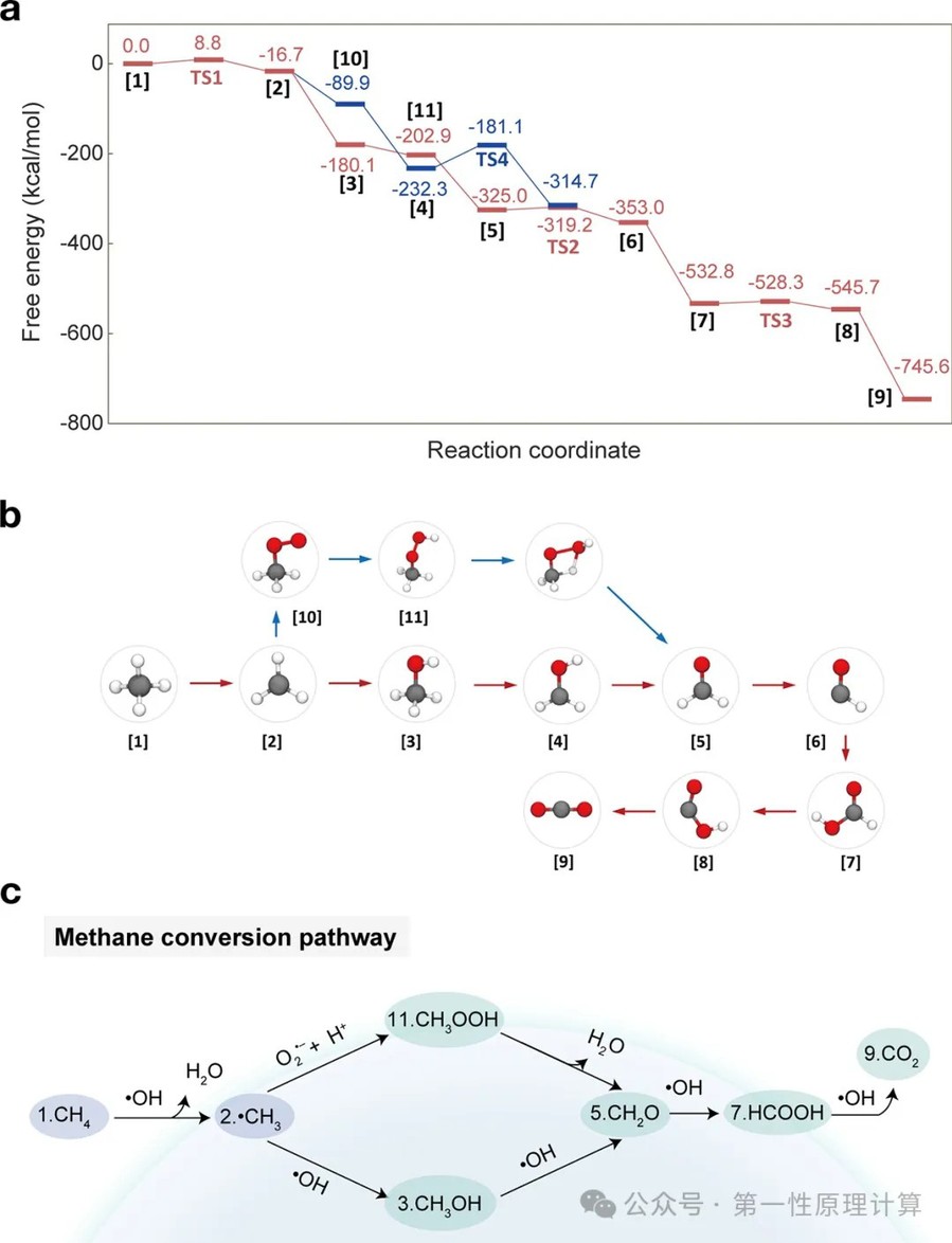 图3. 气-水界面氧化机制的原子尺度见解。(a)使用ONIOM方法计算的CH₄氧化过程的自由能图。(b)连接反应物(CH₄)与产物的多步光氧化反应路径中的关键稳态结构。(c)微滴气-水界面CH₄光转化的机制示意图。