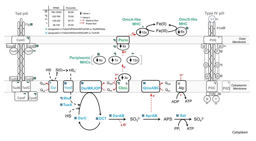 图3. Desulfurivibrio alkaliphilus耦合硫化物氧化与三价铁矿还原过程的分子机制