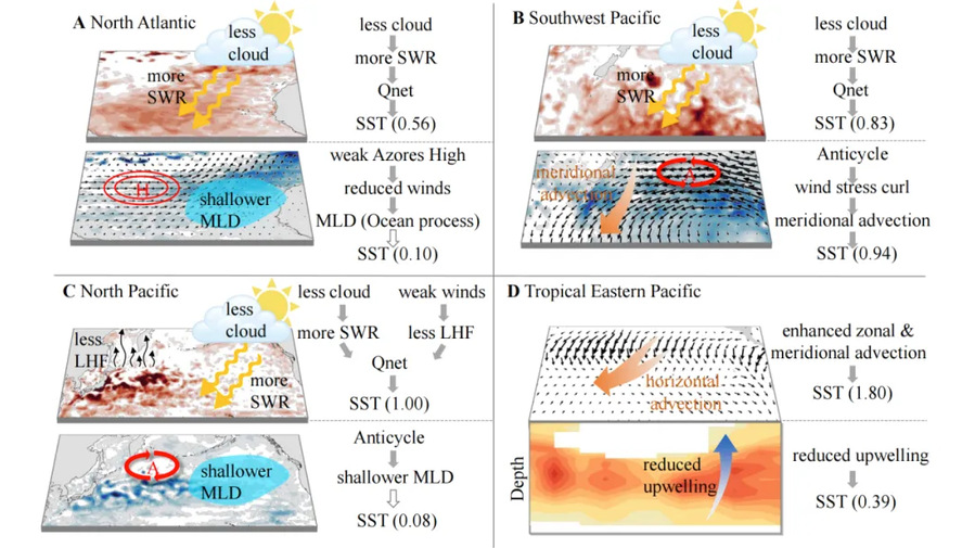 西南太平洋:该地区大气反气旋导致东风增强、西风减弱,进而增强了海洋的经向输送;同时,云量减少使得更多太阳辐射进入海洋,加剧海表变暖;
