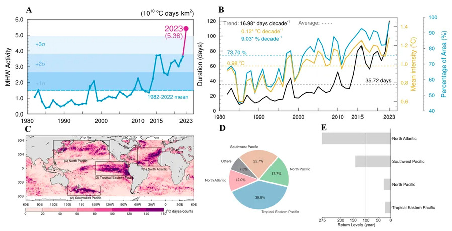 图1 2023年海洋热浪总活动强度创纪录,多个关键海域远超百年一遇极端水平