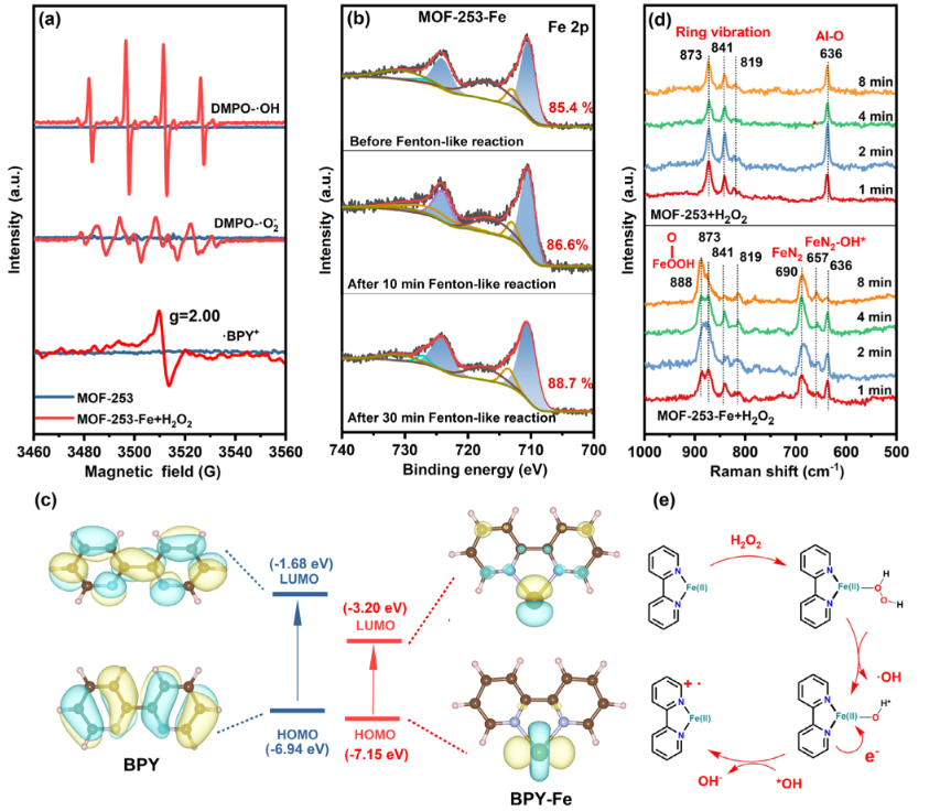 图2. BPY有机自由基的识别与生成途径分析:MOF-253/H2O2与MOF-253-Fe/ H2O2体系中·OH、·O₂-和BPY有机自由基的对比(a),MOF-253-Fe类芬顿反应中铁价态变化(b),BPY与BPY-Fe的HOMO与LUMO(c),MOF-253/H2O2与MOF-253-Fe/H2O2体系原位拉曼光谱图(d),BPY-Fe通过分子内电子转移生成BPY有机自由基途径