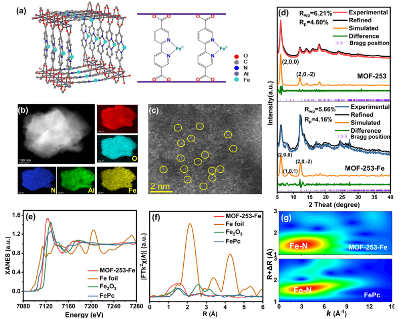 图1. BPY-Fe结构的识别:MOF-253中BPY-Fe单原子的示意图(a),MOF-253-Fe的高角环形暗场扫描透射电镜(HAADF-STEM)及其能谱映射图(b),球差校正HAADF-STEM图像(c),精修XRD图谱(d),归一化Fe K-edge XANES 光谱(e), 傅里叶变换的k2-weighted EXAFS (f),经小波变换的EXAFS 图谱(g)