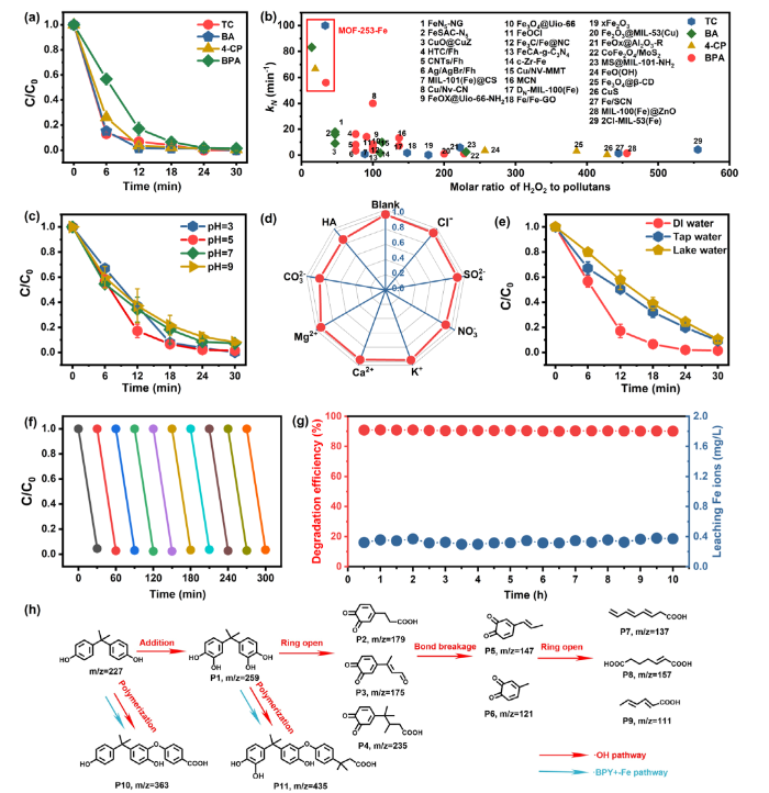 图4. MOF-253-Fe类芬顿催化降解有机污染物活性和稳定性:双酚A、苯酚、4-氯酚与四环素的降解动力学(a)及其归一化降解动力学常数比较(b),pH(c)、无机离子与有机质(d)、水质(e)对有机污染物降解的影响,双酚A在10次连续循环(f)和柱反应器(g)中的降解效率,BPA降解中间产物和路径分析(h)