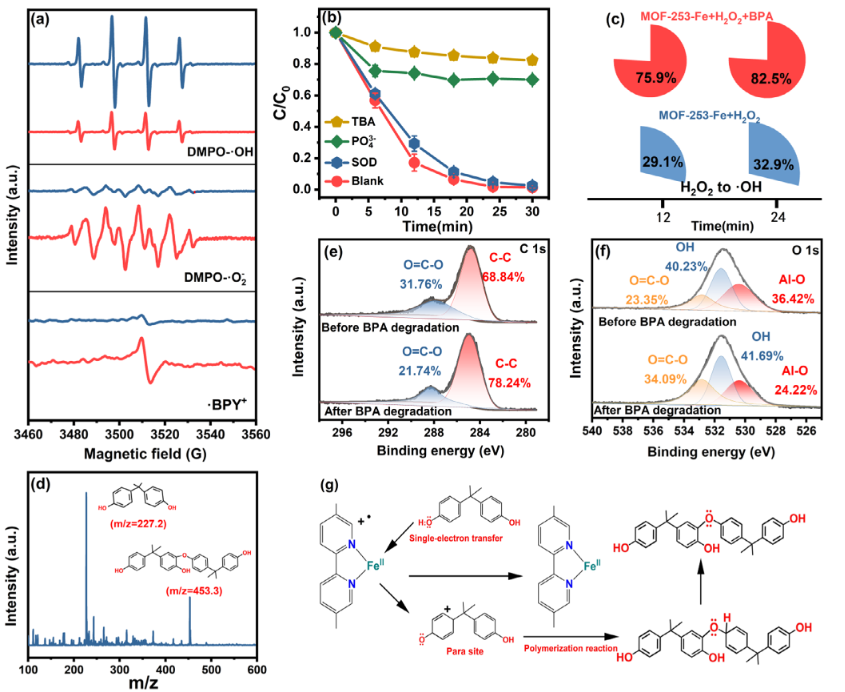 图3. BPY-Fe位点与有机污染物之间电子转移路径:MOF-253-Fe/H2O2与MOF-253-Fe/H2O2/BPA体系中·OH、·O₂-和BPY有机自由基对比(a)及·OH、·O₂-和BPY有机自由基降解有机污染物贡献(b),MOF-253-Fe/H2O2与MOF-253-Fe/H2O2/BPA体系H2O2生成·OH效率(c),MOF-253-Fe表面聚合产物分析(d),MOF-253-Fe反应前后的C1s与O2pXPS光谱(e)(f),有机污染物与BPY-Fe位点电子转移路径(g)