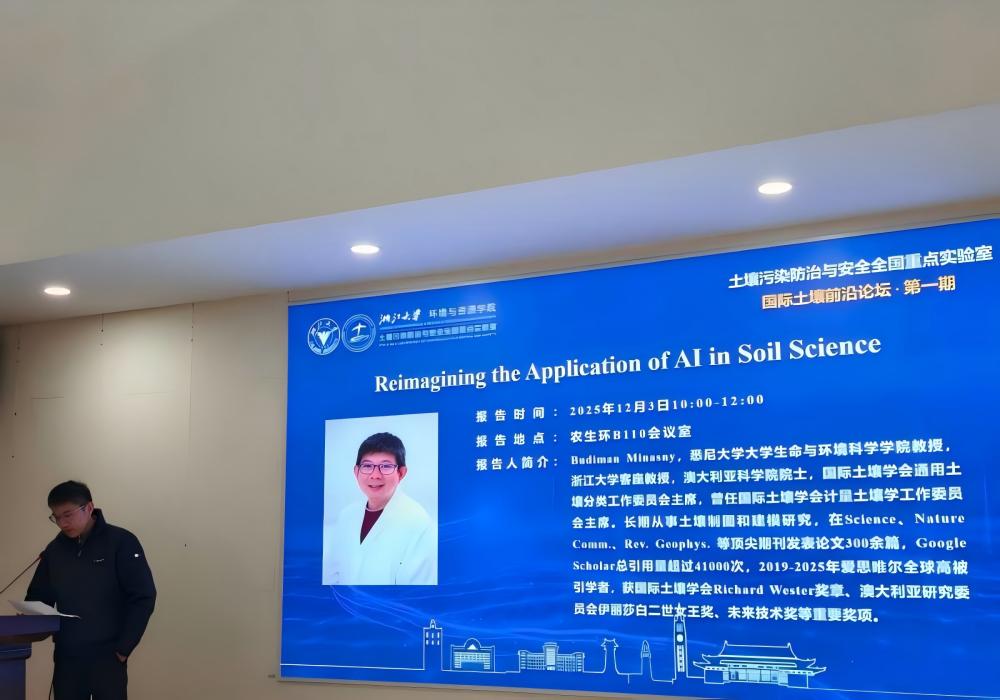 Budiman Minasny教授以“Reimagining the Application of AI in Soil Science”为题,呈现了一场专业而前沿的学术专题报告。Budiman Minasny教授先是系统阐释了如何运用卷积神经网络解析土壤光谱数据,从复杂光谱信号中自动提取关键特征,进而实现对土壤pH值、有机碳含量等多种属性的快速、精准反演;随后介绍了如何通过AI自动阅读、理解并归类学术论文,按主题、方法与结论实现海量文献的高效整合与梳理;报告结尾,他指出未来人工智能将进一步拓展至土壤系统功能模拟与智慧管理领域,通过融合多源异构土壤数据构建高精度“数字土壤”系统,动态模拟土壤碳固定、养分循环及生产力演变,为土壤资源可持续管理提供智能支撑。