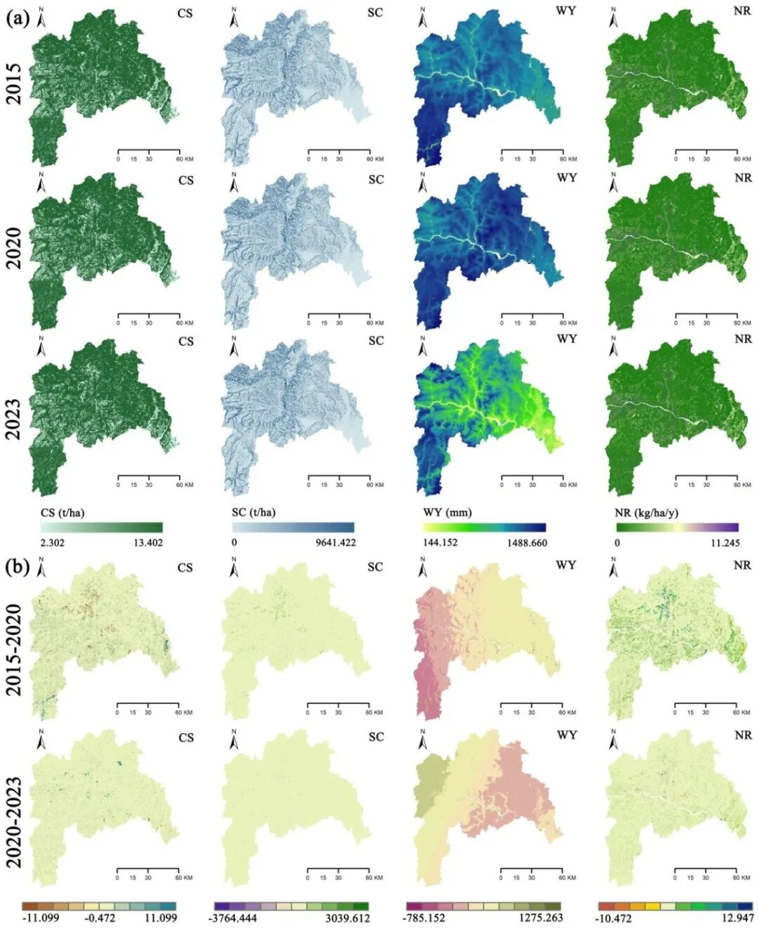 研究结果表明,研究区通过工程实施,显著提高了碳储存(CS)、土壤保持(SC)、产水量(WY)和氮保持(NR)等主要生态系统服务。