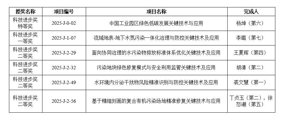 此次获奖成果中,实验室骨干成员杨坤团队深度参与的《中国工业园区绿色低碳发展关键技术与应用》项目摘得科技进步奖特等奖;李璐团队参与的《流域地表-地下水氮污染一体化治理与防控关键技术及应用》项目斩获科技进步奖一等奖;另有王夏晖团队的《面向协同治理的水污染物排放标准体系优化关键技术及应用》、胡清团队的《污染地块绿色修复模式与安全利用监管关键技术及应用》、裘文慧团队牵头完成的《水环境内分泌干扰物风险精准识别与防控关键技术及应用》以及丁贞玉、徐怒潮团队的《基于精细刻画的复合有机污染场地精准修复关键技术与应用》共5项成果荣获科技进步奖二等奖。